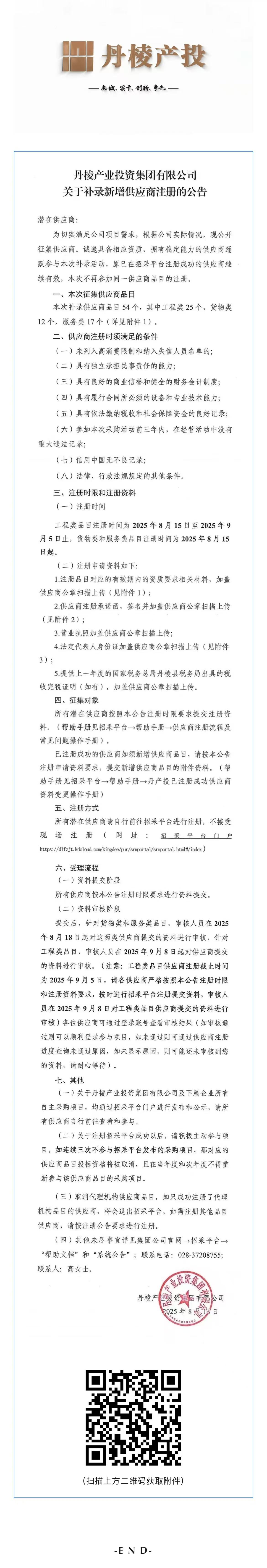 丹棱產(chǎn)業(yè)投資集團有限公司關(guān)于補錄新增供應(yīng)商注冊的公告