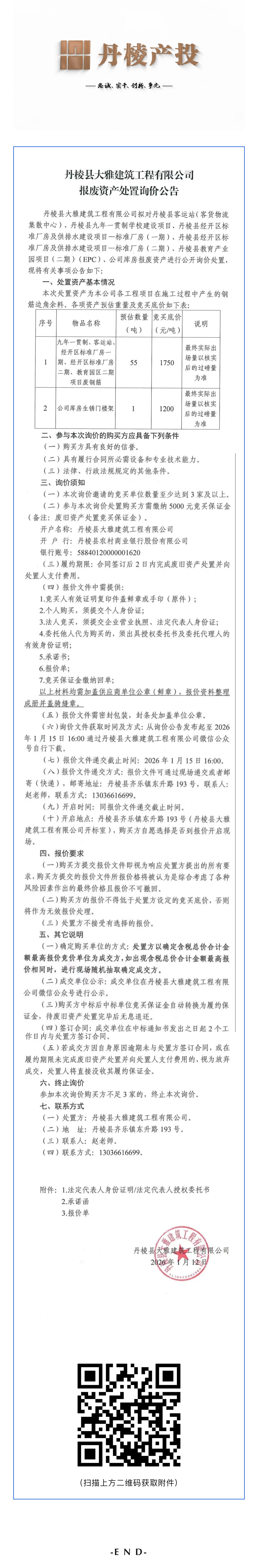 丹棱縣大雅建筑工程有限公司報廢資產處置詢價公告