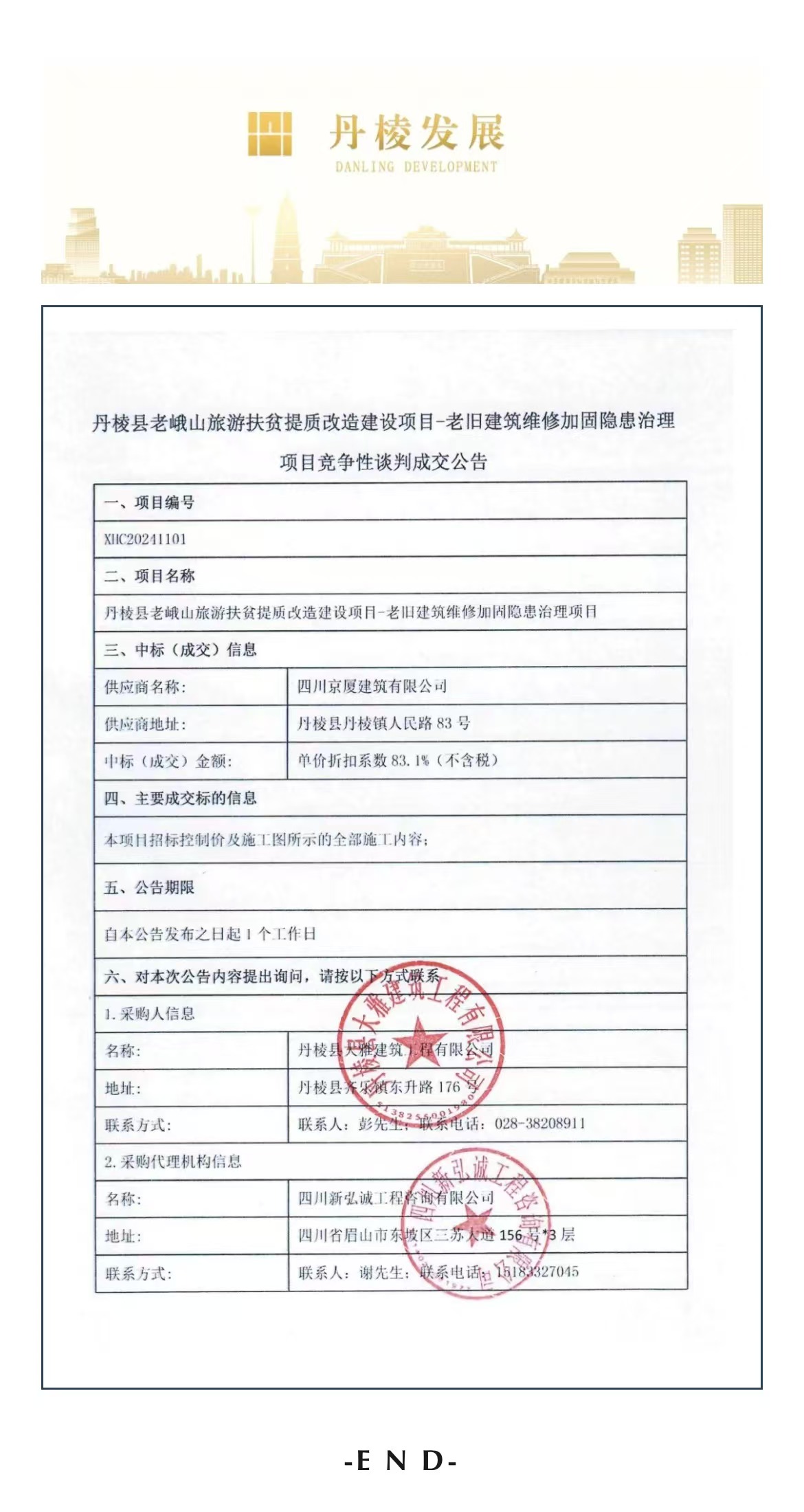 丹棱縣老峨山旅游扶貧提質(zhì)改造建設項目——老舊建筑維修加固隱患治理項目競爭性談判成交公告