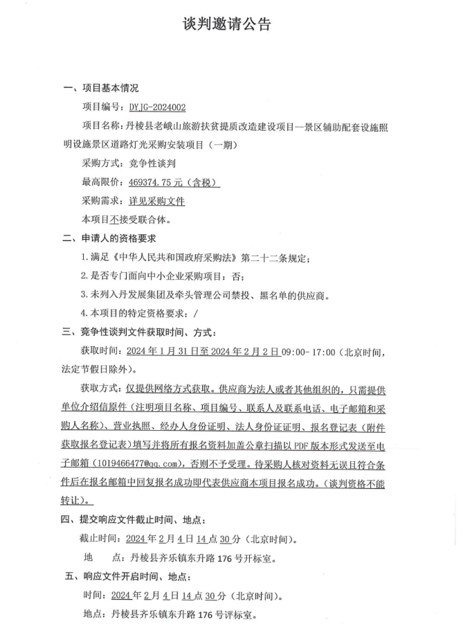 丹棱縣老峨山旅游扶貧提質(zhì)改造建設(shè)項(xiàng)目——景區(qū)輔助配套設(shè)施照明設(shè)施景區(qū)道路燈光采購安裝項(xiàng)目(一期)談判邀請(qǐng)公告